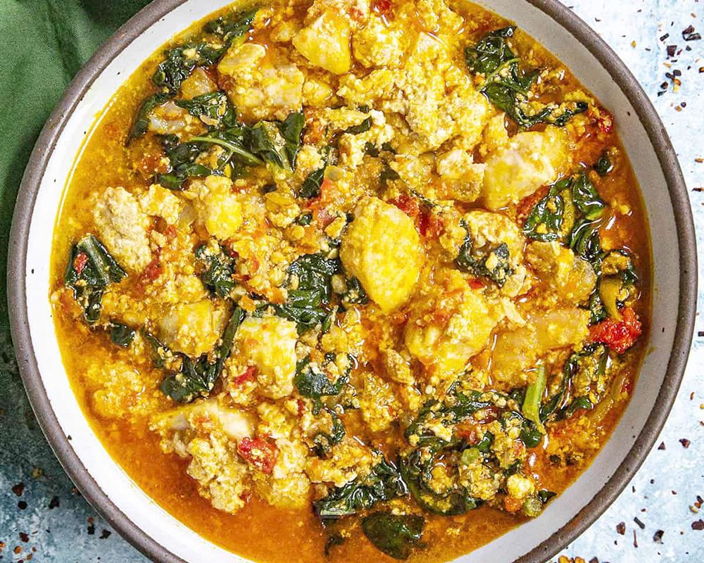 A hearty vegetable soup made from ground melon palm oil, and a blend of leafy greens. Garnished with an assortment of meats, and pairs well with pounded yam.