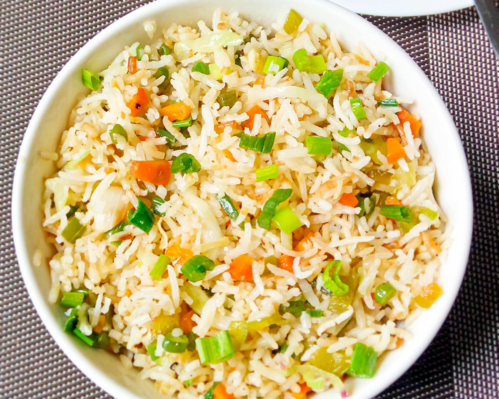 Naija style curry based fried rice. Garnished with colorful stir-fried vegetables and fried beef liver.